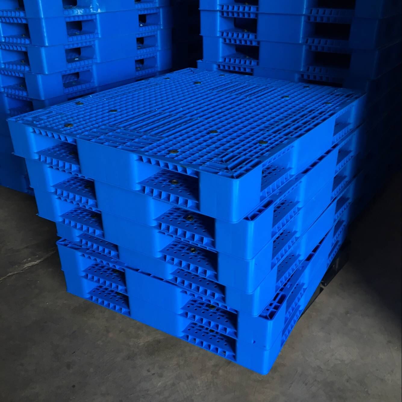 第四、產品工藝在改進,早期的雙面托盤受注塑機鎖模力的限制多以二次焊接為主,為了保證托盤的強度只能從重量上想辦法。現在注塑機的鎖模力大大提高,均采用一次性注塑成型,相同結構的托盤使用更少的材質即可達到相同的載重要求。